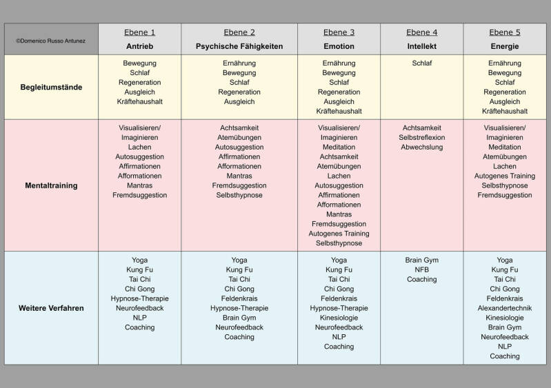 Mit den vielfältigen Techniken des Mentaltraining haben wir die Möglichkeit, die Probleme auf den fünf oben beschriebenen psychoregulativen Ebenen zu lösen.